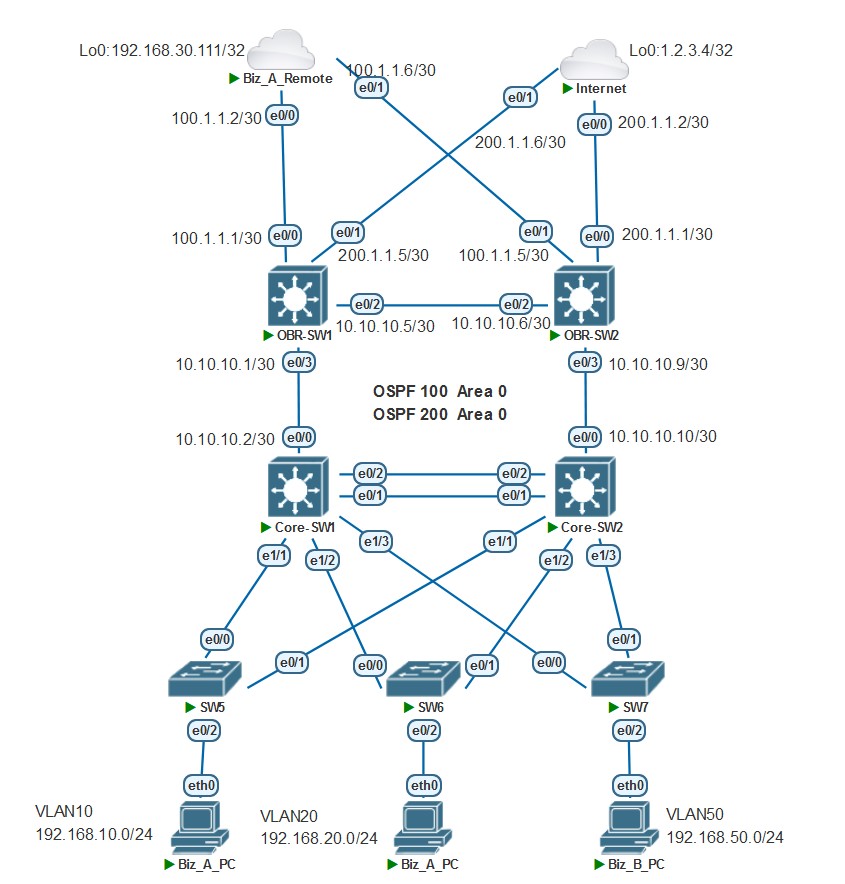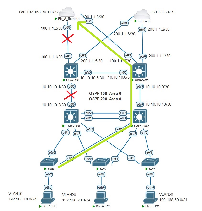 • 大概思路思路是通过 Track 关联降低 VRRP 的优先级使其成为 VRRP 的 Backup 组,流量路径自动切换至另一台设备。举个例子:当 Core-SW1 以出接口 e0/0 监测到与 OBR-SW1 直连线路不通或监测到 Biz_A_Remote 的 e0/0 不通(这是个 and 的关系,用编程语言的描述就是:条件 A 和条件 B 同时为 True,结果才为 True),此时 SLA 监测状态为 Time-out ,在 VRRP 与 Track 联动下降低 VRRP 优先级使其成为 Backup 状态,Biz_A_PC 去往 Biz_A_Remote 的流量路径切换至 Core-SW2 ,途径:Core-SW2 –> OBR-SW2 最终到达 Biz_A_Remote ,如图所示: