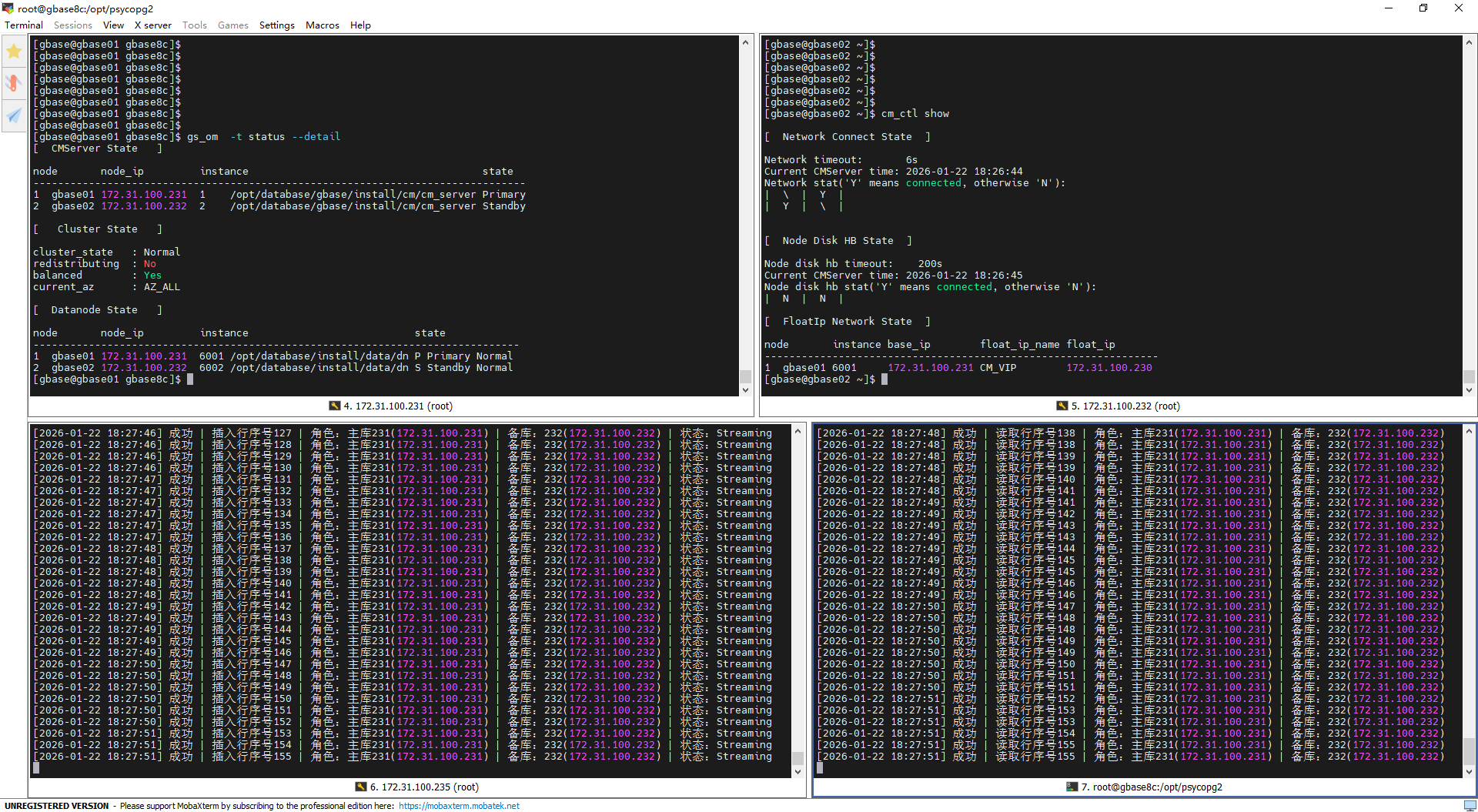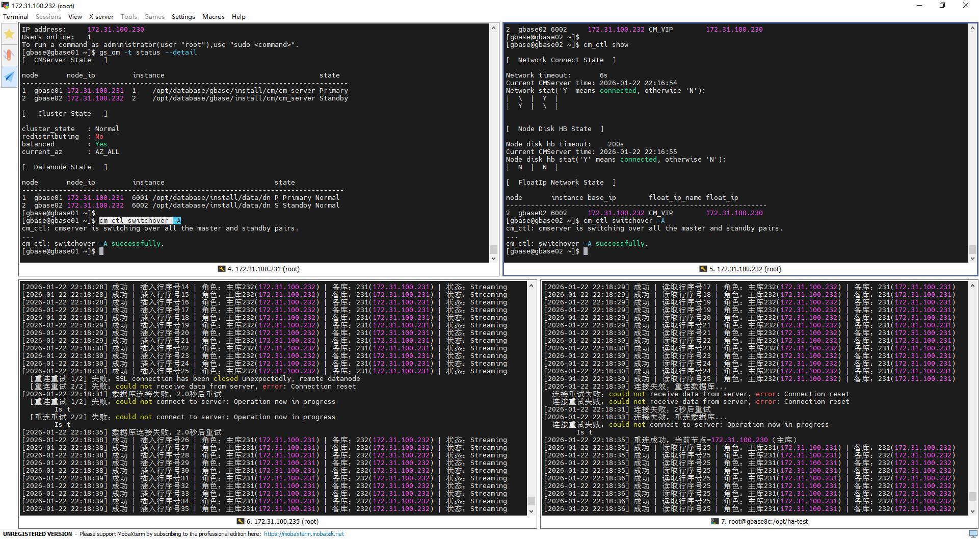 倒换前(22:18:30):集群状态稳定,232为主库、231为备库,主备同步状态为