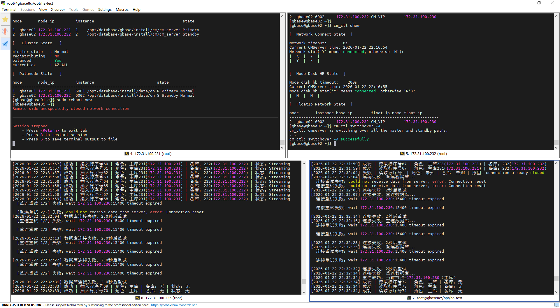 重启中(连接失效+多轮超时重试):主节点重启导致连接关闭(connection already closed),脚本触发重连,先因连接重置重试2次失败;后续多轮重连均因浮动IP 230:15400连接超时失败,每轮失败后等待2秒重试,期间读取失败且无法识别角色/备库信息。