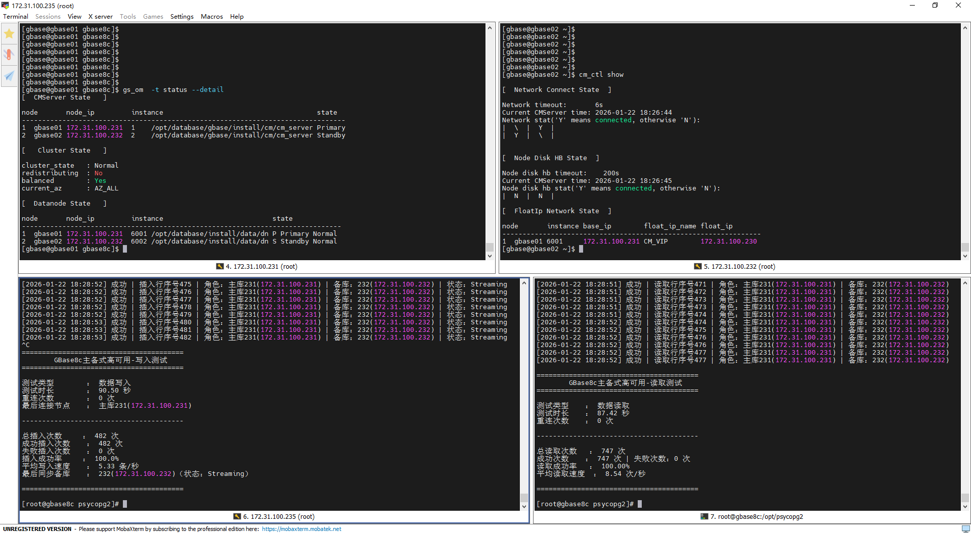 本次测试覆盖主动主备倒换、主节点重启、备节点重启三类核心场景,共完成四次主备倒换验证,整体表现完全符合预期,充分验证了GBase8c主备集群的高可用能力: