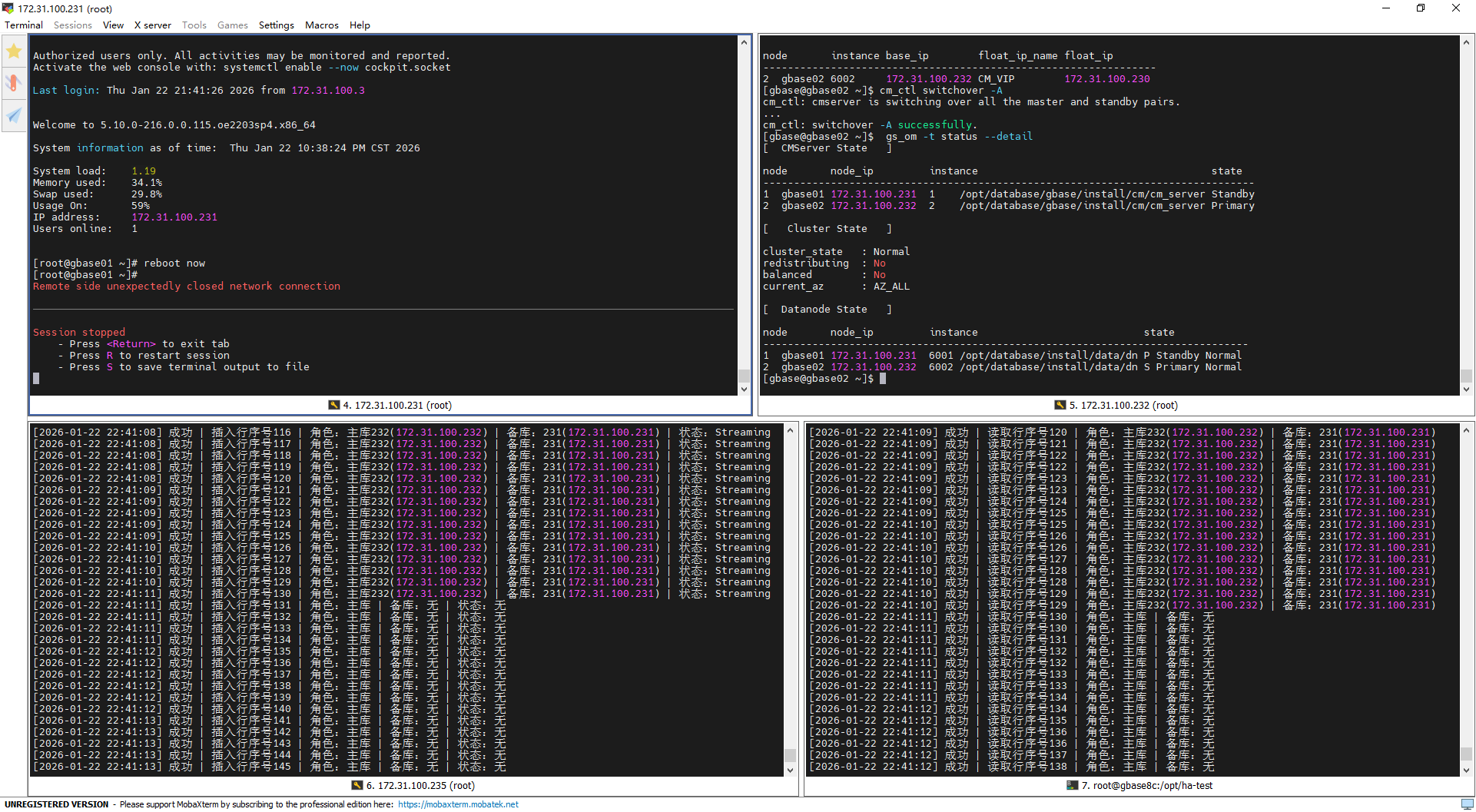 重启前(22:31:59):集群状态稳定,231为主库、232为备库,主备同步状态为